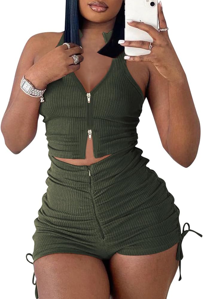 - SUMMER OUTFITS FOR WOMEN-Summer short sets two piece outfits for women, solid color, bodycon, basis tank crop top never go out of style, pair with the adjustable drawstring butt lifting shorts gives your butt a streamlined look like a juicy peach, extremely flattering. The unique ruched design increase the sense of silhouette and highlight the charming curves, making this 2 piece outfit for women ruched more sexy.