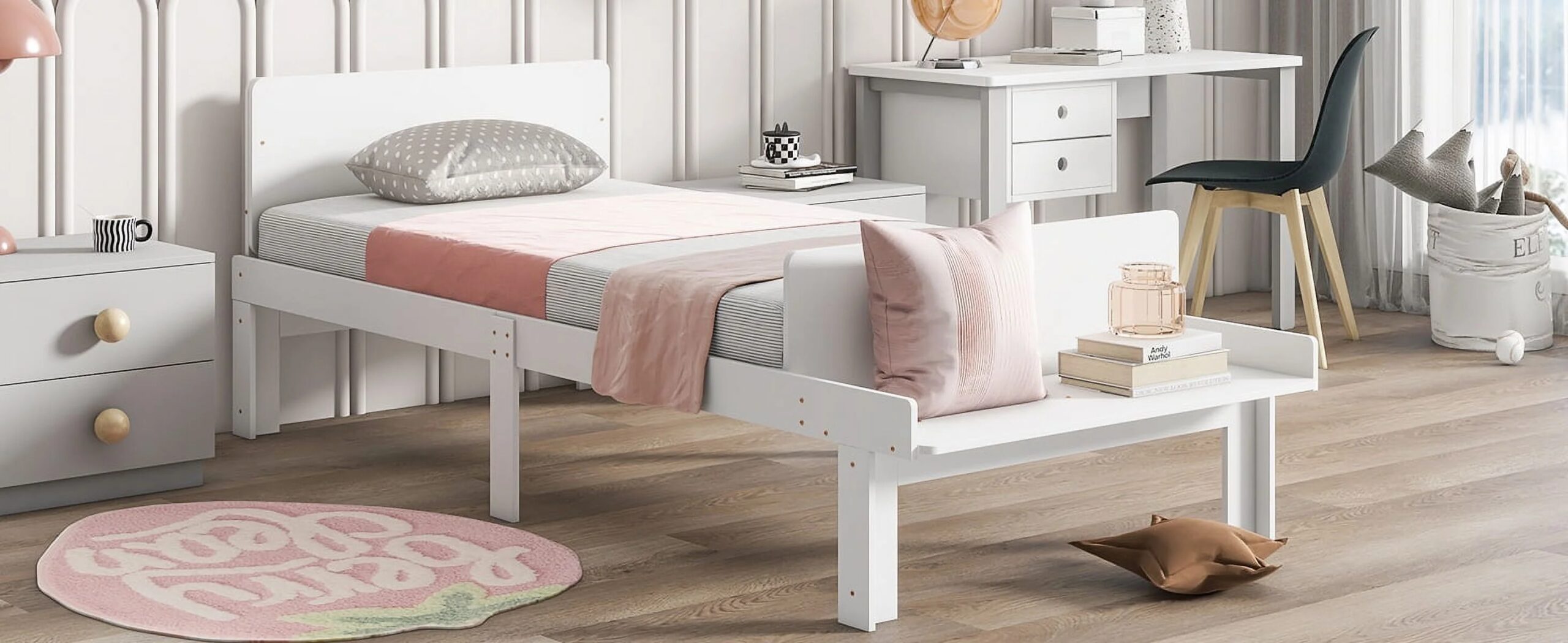 Enhance your bedroom with this elegant white twin bed featuring a footboard bench. Combining luxury and functionality, it offers added comfort and a touch of sophistication to your living space. Perfect for creating a serene and stylish retreat, this timeless piece transforms your bedroom into a modern sanctuary.