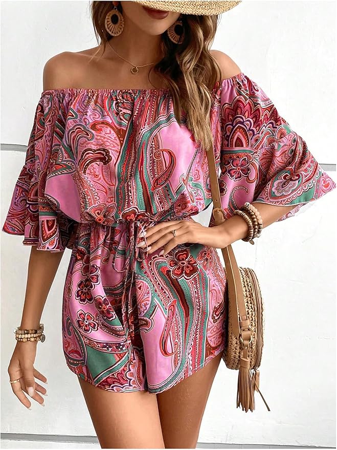 - Features: Elastic waist, boho style, one piece short, workout jumpsuit, paisley print, off the shoulder, short, one piece outfit, overall for women, three quarter length sleeve, flounce sleeve, high waist.