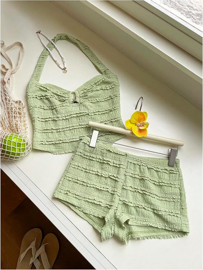 - Features: Womens summer short set, ring linked, halter neck, open back, sleeveless, slim fit, great for creating a stylish and effortless vacation look